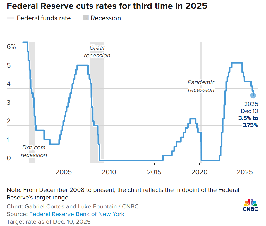 In its latest Federal Open Market Committee (FOMC) meeting (10/12/2025), the Fed further decreased the federal funds rate by 0.25 percentage points, cutting keys interest rate down to 3.50–3.75%. This marks the third consecutive rate cut in 2025 and the lowest level since November 2022. This move followed two tense days of meetings by FOMC, aimed at supporting economic growth and dealing with signs of job losses in the labour market. Remarkably, the Fed did not seek aggressive economic stimulus, but rather focused on adjustments to avoid a potentially deep recession.